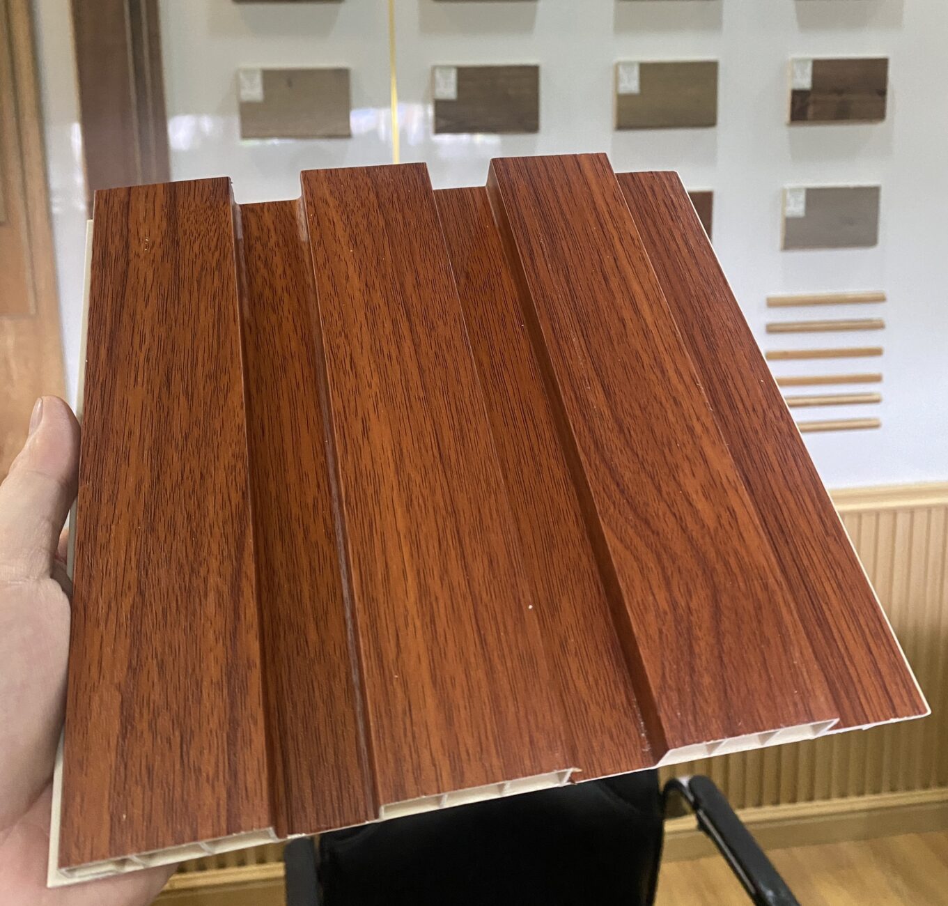 Cấu tạo: Tấm ốp tường PVC thường được làm từ nhựa PVC dạng tấm, có thể có cấu trúc lõi cứng để tăng độ cứng và độ bền.